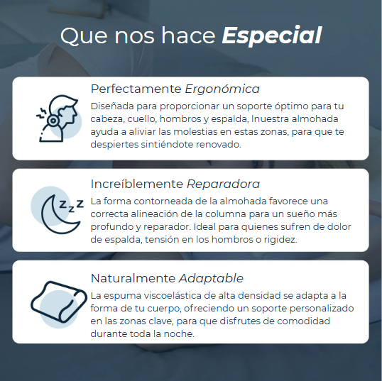 “Llevo semanas durmiendo con esta almohada y la diferencia se nota desde la primera noche. Tenía dolores en el cuello cada mañana y ya casi han desaparecido. La forma se adapta perfectamente y me ayuda a mantener una postura cómoda, tanto si duermo de lado como boca arriba. Una compra totalmente recomendable.
